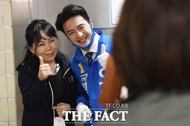 [더팩트 | 의정부=남윤호 기자] 제21대 총선 경기도 의정부시갑 오영환 더불어민주당 후보(가운데)가 5일 오후 경기도 의정부시 의정부역 지하상가를 찾아 시민과 기념촬영을 하고 있다.