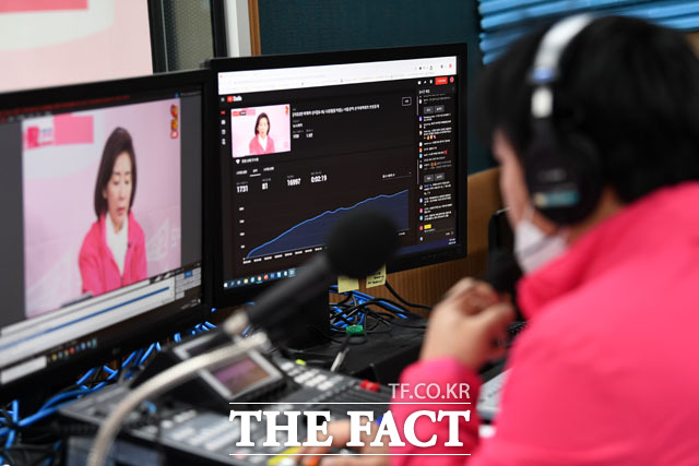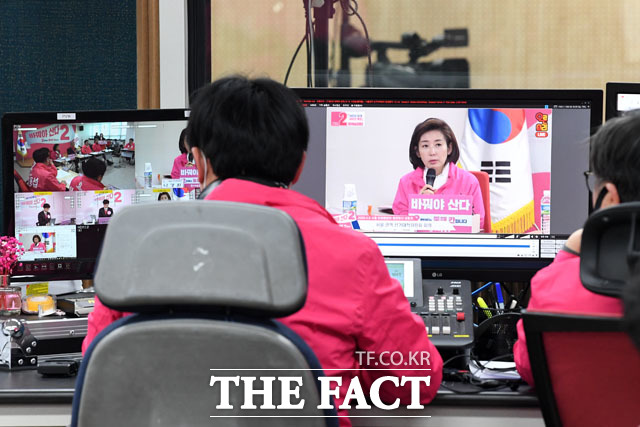 [더팩트 | 남윤호 기자] 미래통합당 나경원 서울선거대책위원장이 6일 오전 서울 영등포구 중앙당사에서 미래한국당의 유튜브 채널 '오른소리' 영상을 녹화하고 있다.
