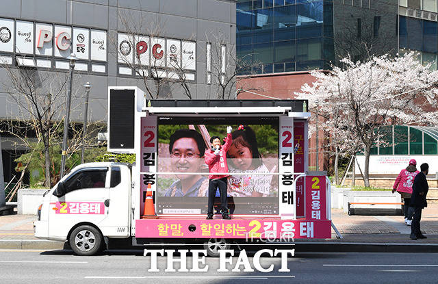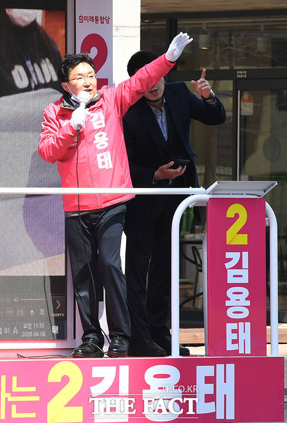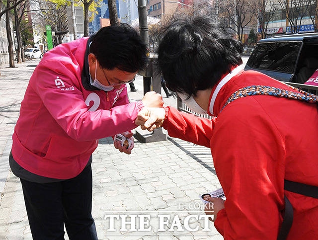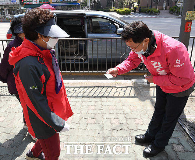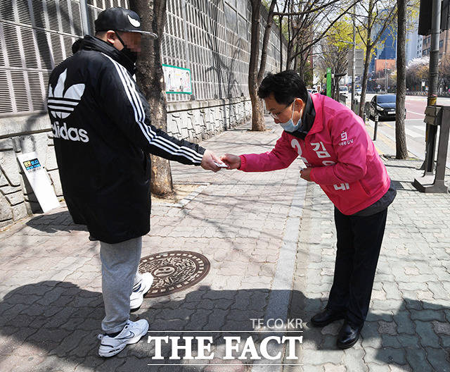 [더팩트ㅣ배정한 기자] 김용태 미래통합당 서울 구로을 국회의원 후보(왼쪽)가 6일 오전 서울 구로구 신도림동주민센터 인근에서 주민들에게 지지를 호소하고 있다.