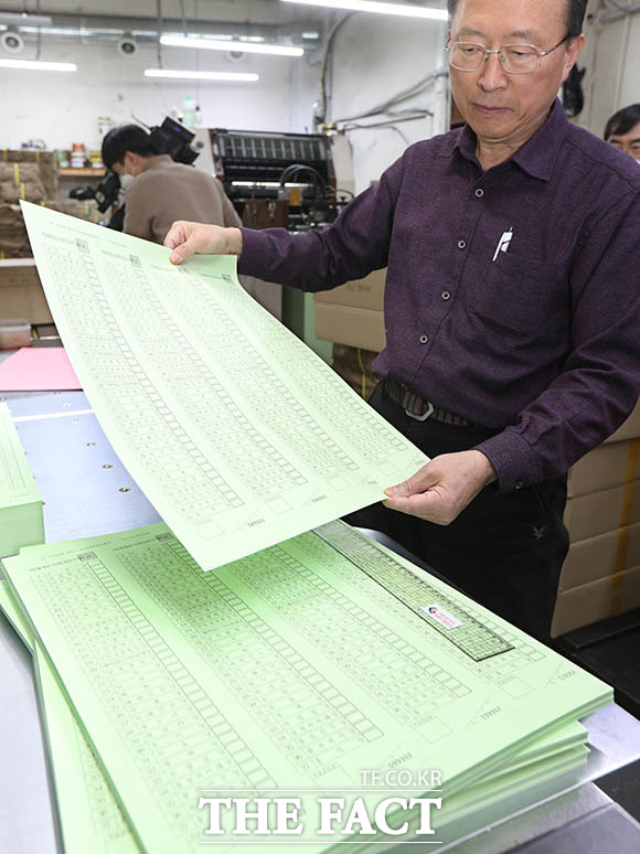 [더팩트ㅣ김세정 기자] 6일 오후 서울 중구 한 인쇄소에서 관계자가 인쇄된 제21대 국회의원 선거 투표용지를 확인하고 있다. 이번 선거에서 비례대표 선거 참여 정당은 35곳이며, 정당투표 용지 길이는 48.1cm가 됐다.sejungkim@tf.co.kr사진영상기획부 photo@tf.co.kr