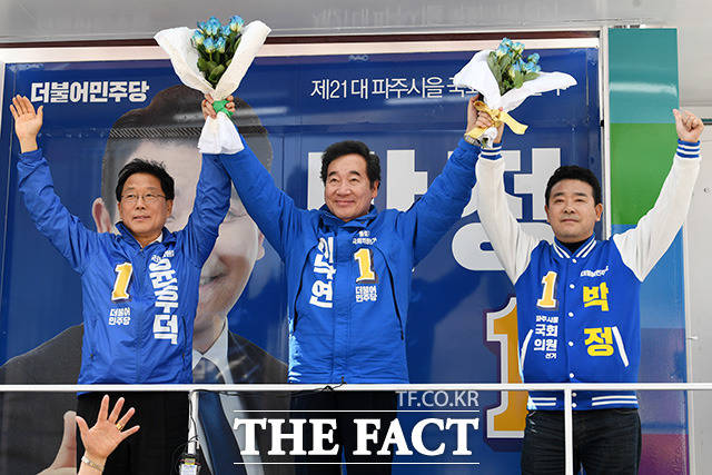 [더팩트ㅣ파주=남용희 기자] 이낙연 더불어민주당 상임공동선대위원장(가운데)이 6일 오후 경기 파주 금릉역 앞 중앙광장에서 파주갑 윤후덕 후보(왼쪽)와 파주을 박정 후보를 지원 유세하고 있다.
