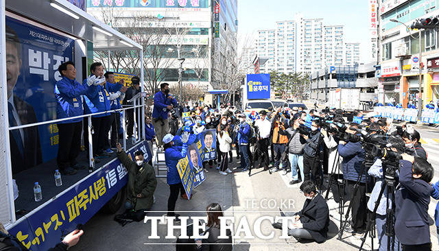 [더팩트ㅣ파주=남용희 기자] 이낙연 더불어민주당 상임공동선대위원장이 6일 오후 경기 파주 금릉역 앞 중앙광장에서 파주갑 윤후덕 후보와 파주을 박정 후보를 지원 유세하고 있다.