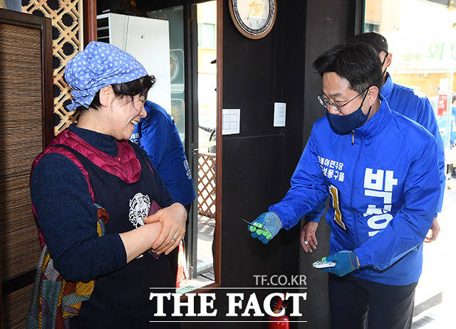 [더팩트ㅣ이동률 기자] 제21대 총선에서 서울 중구성동구을에 출마한 박성준 더불어민주당 후보가 6일 오후 서울 중구 회현역 일대에서 유세를 펼치며 유권자들의 지지를 호소하고 있다.