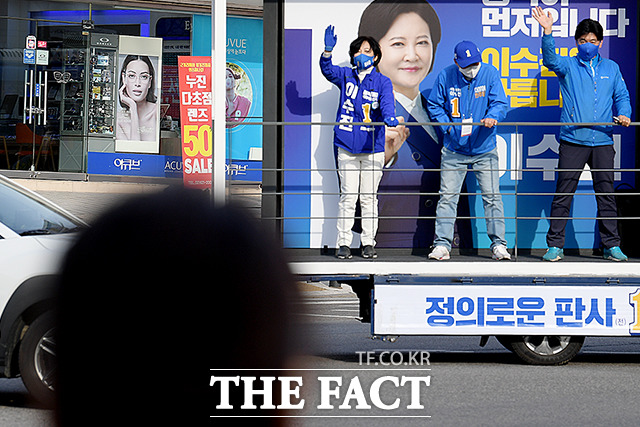 [더팩트|이선화 기자] 이수진 더불어민주당 동작을 국회의원 후보가 6일 오후 서울 동작구 상도동 인근에서 유권자들에게 지지를 호소하고 있다.