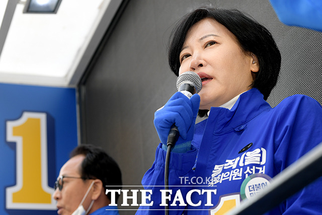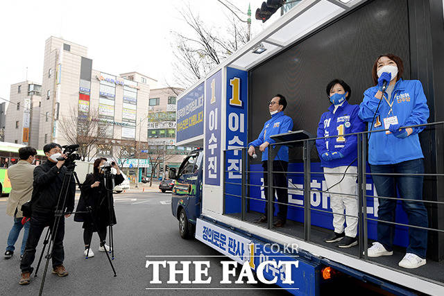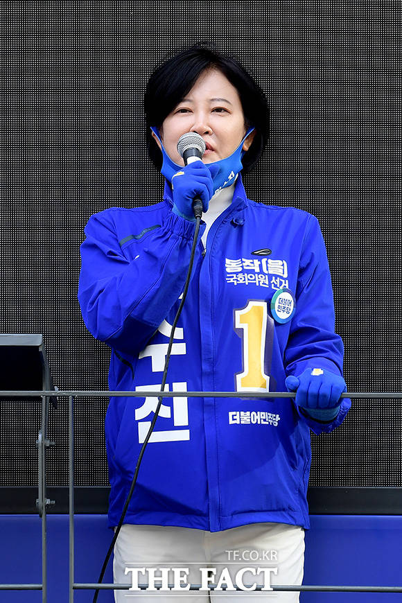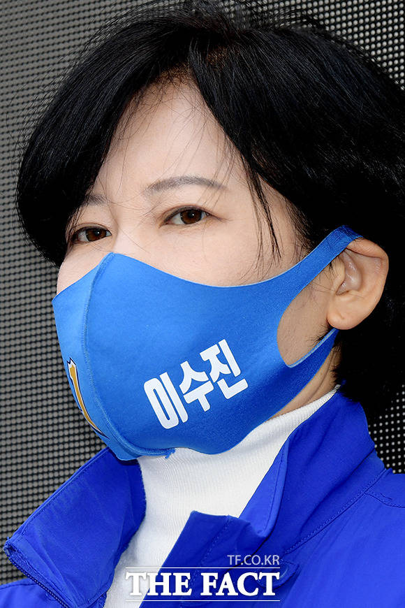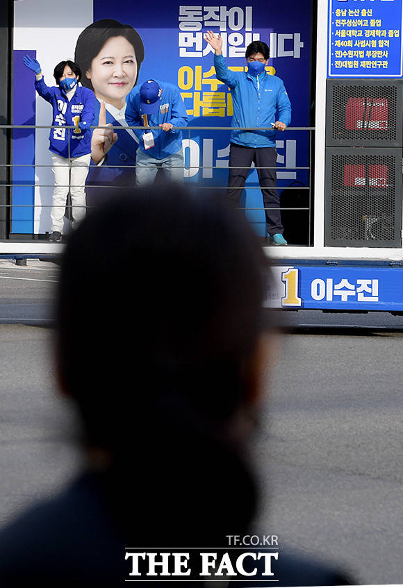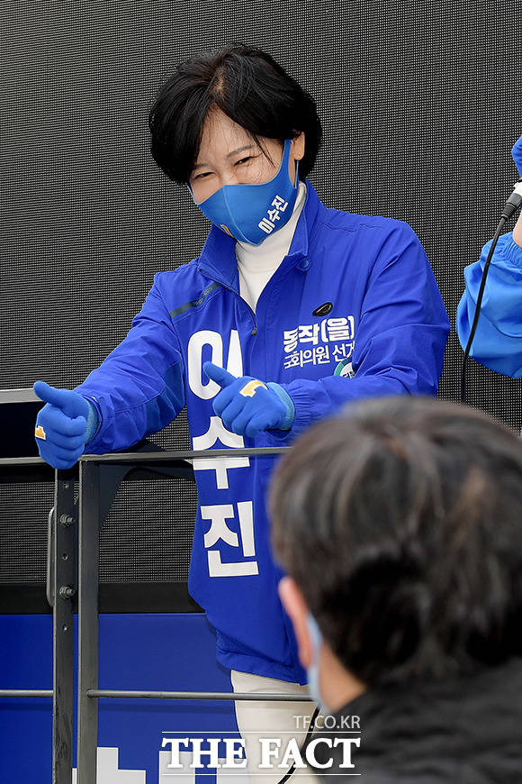 [더팩트|이선화 기자] 이수진 더불어민주당 동작을 국회의원 후보가 6일 오후 서울 동작구 상도 래미안 정문 인근에서 유권자들에게 지지를 호소하고 있다.