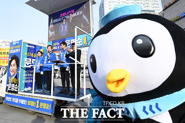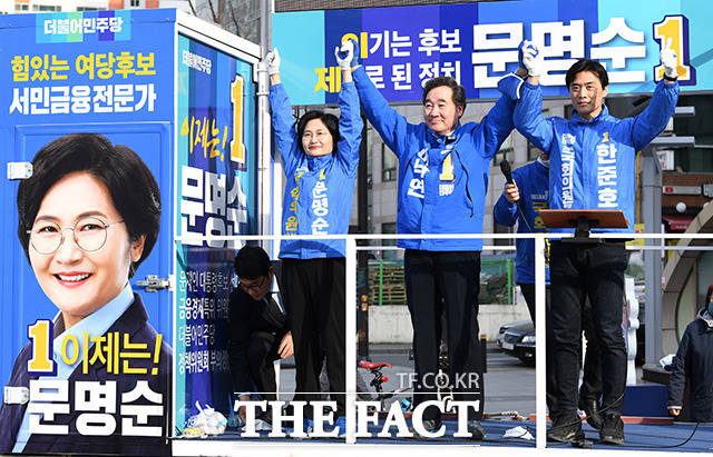 [더팩트ㅣ고양=남용희 기자] 이낙연 더불어민주당 상임공동선대위원장(가운데)이 6일 오후 경기 고양 덕양구 화정역 광장에서 문명순 고양갑 후보(왼쪽)와 한준호 고양을 후보를 지원 유세하고 있다.