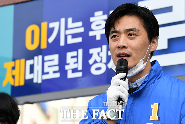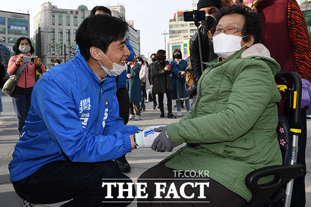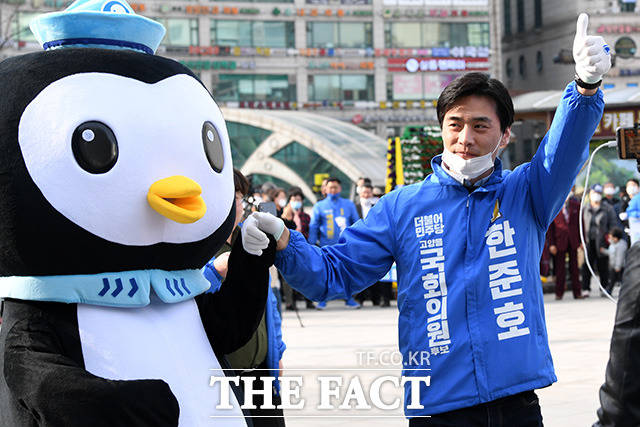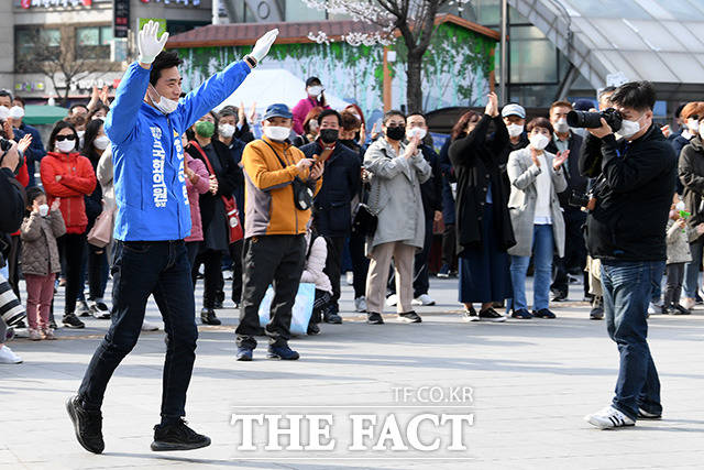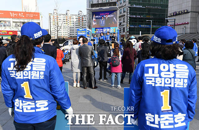 [더팩트ㅣ고양=남용희 기자] 한준호 고양을 후보가 6일 오후 경기 고양 덕양구 화정역 광장에서 이낙연 더불어민주당 상임공동선대위원장의 지원 유세를 받으며 지지를 호소하고 있다.