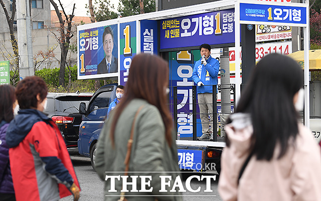 [더팩트ㅣ이새롬 기자] 제21대 국회의원선거 서울 도봉을에 출마한 오기형 더불어민주당 후보가 7일 오전 서울 도봉구 방학역북부 일대에서 유세차에 올라 출근하는 시민들에게 인사하고 있다. saeromli@tf.co.kr 사진영상기획부 photo@tf.co.kr