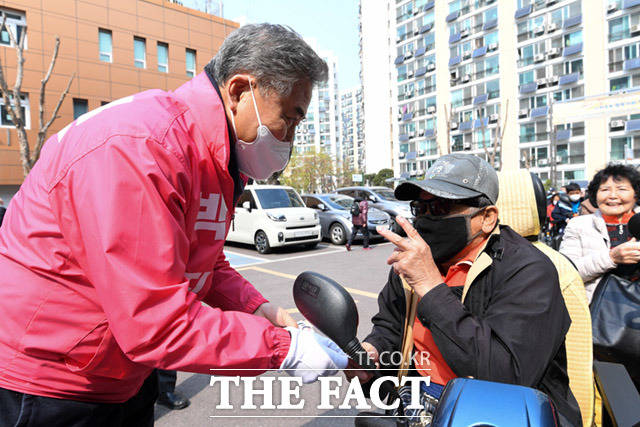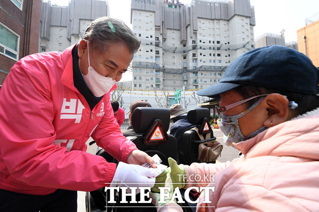 [더팩트ㅣ임세준 기자] 4.15총선 서울 강남을에 출마한 박진 미래통합당 후보가 7일 오전 서울 강남구 개포동 하상복지관에서 주민들을 만나 지지를 호소하고 있다.