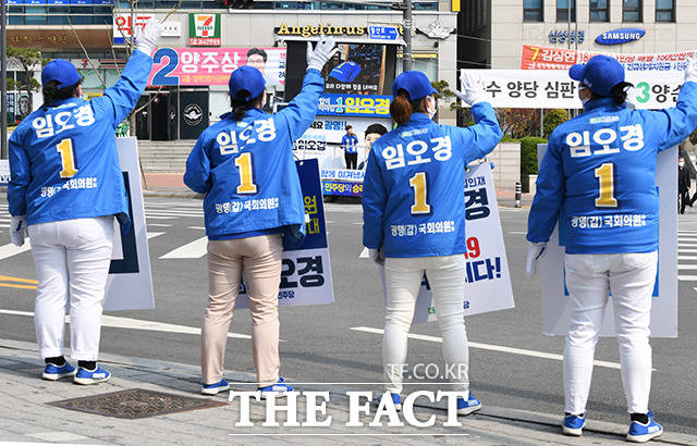 임오경 더불어민주당 경기 광명시갑 국회의원 후보(왼쪽 두번째)가 7일 오전 경기도 광명시 철산역 앞 삼거리에서 유세차량에 올라 시민들에게 지지를 호소하고 있다. / 광명=배정한 기자