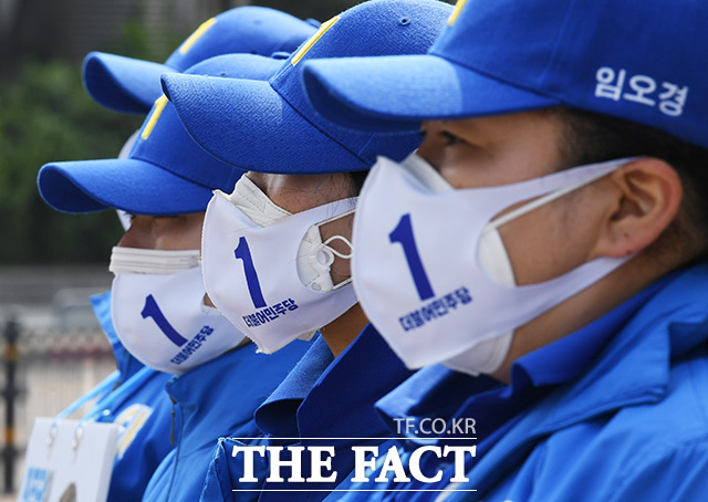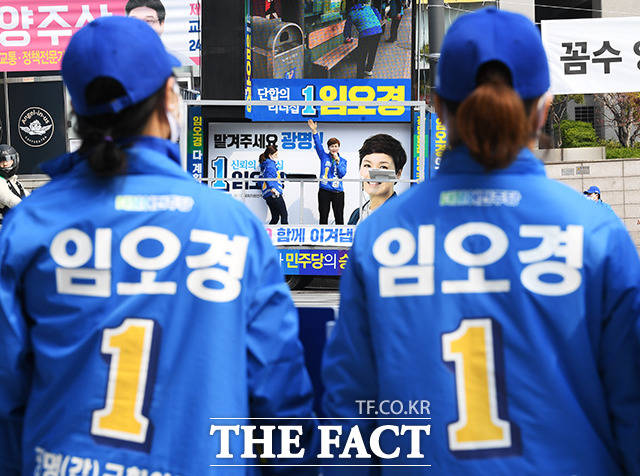 [더팩트ㅣ광명=배정한 기자] 임오경 더불어민주당 경기 광명시갑 국회의원 후보(왼쪽 두번째)가 7일 오전 경기도 광명시 철산역 앞 삼거리에서 유세차량에 올라 시민들에게 지지를 호소하고 있다.