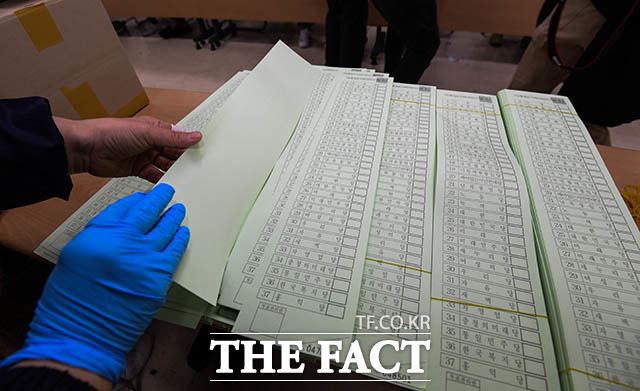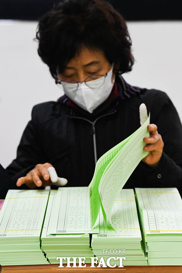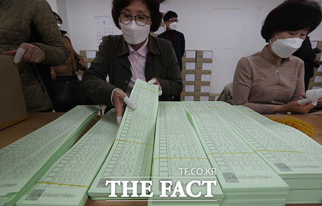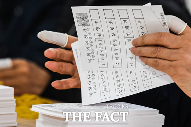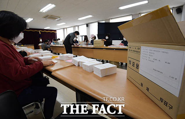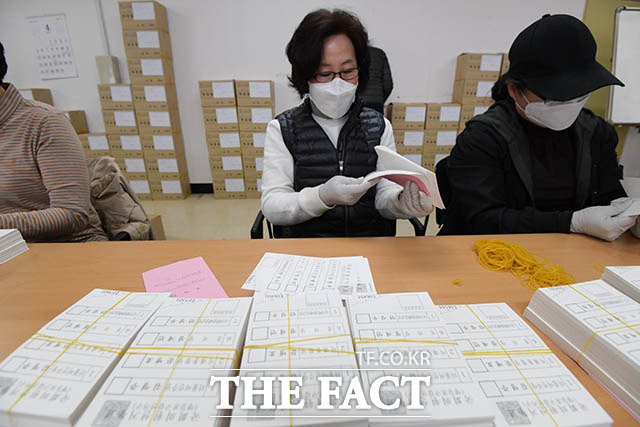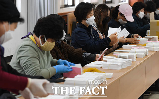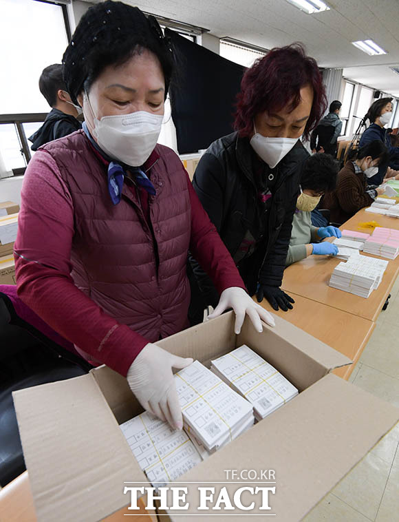 [더팩트ㅣ김세정 기자] 4.15 총선 사전투표일을 사흘 앞둔 7일 오전 서울 영등포구선거관리위원회에서 관계자들이 제21대 국회의원 선거 투표용지를 검수하고 있다.
