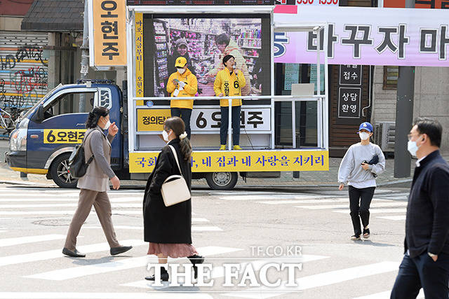 [더팩트|이선화 기자] 오현주 정의당 마포을 국회의원 후보가 7일 오후 서울 마포구 연남동 인근에서 유권자들에게 지지를 호소하고 있다.