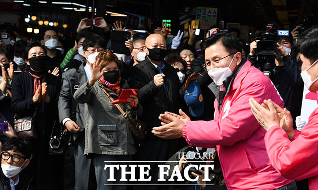 [더팩트ㅣ김세정 기자] 제21대 국회의원 선거에서 서울 종로구에 출마한 황교안 미래통합당 후보가 7일 오후 서울 중구 신당중앙시장에서 펼쳐진 지상욱 중구·성동을 후보와의 합동 유세에 나선 가운데 지지자들의 박수에 화답하고 있다.sejungkim@tf.co.kr사진영상기획부 photo@tf.co.kr