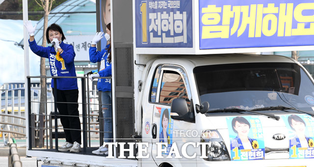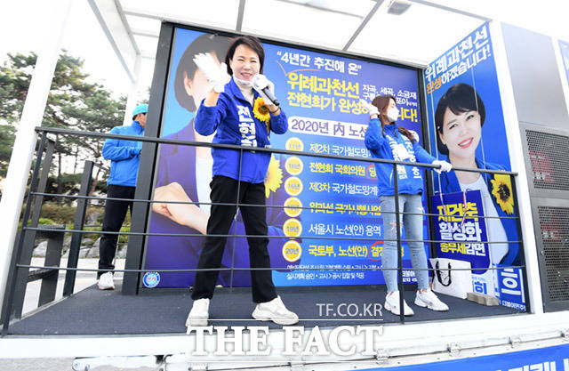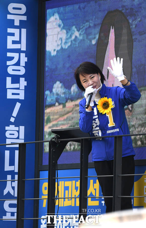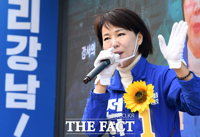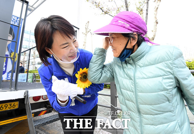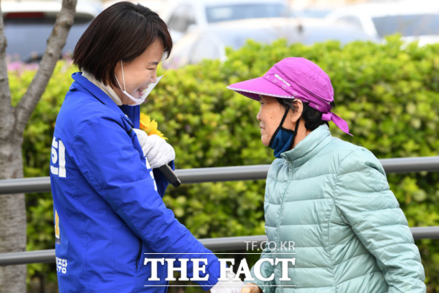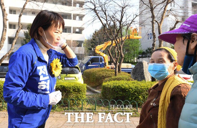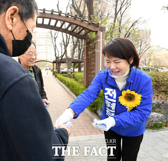 [더팩트ㅣ임세준 기자] 4.15총선 강남을에 출마한 전현희 더불어민주당 후보가 7일 오후 서울 강남구 수서동 수서신동아아파트에서 주민들을 만나 반갑게 인사하고 있다.