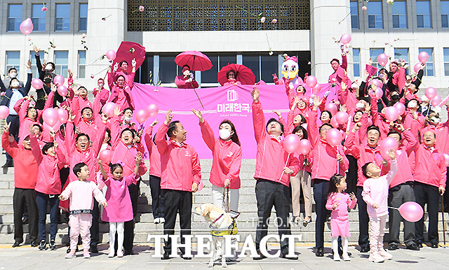 [더팩트ㅣ국회=이새롬 기자] 원유철 미래한국당 총괄선대위원장과 비례대표 후보 등 당원들이 8일 오전 서울 여의도 국회 본청 앞에서 핑크챌린지 퍼포먼스를 하며 분홍 장미꽃을 던지고 있다. 미래한국당은 코로나19로 지친 국민에게 웃음과 희망을 전달하고 당의 상징 색깔인 핑크색을 홍보하기 위해 '핑크챌린지'를 기획하게 됐다.