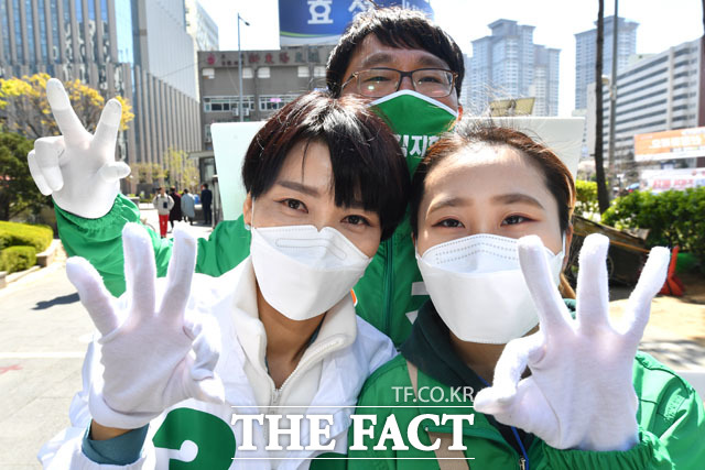 [더팩트 | 남윤호 기자] 김정화 민생당 공동대표(왼쪽)와 민생당 영등포구을 김지향 후보(가운데), 선거사무원이 8일 오전 서울 영등포구 여의도역 인근에서 유세를 앞두고 기념촬영을 하고 있다.