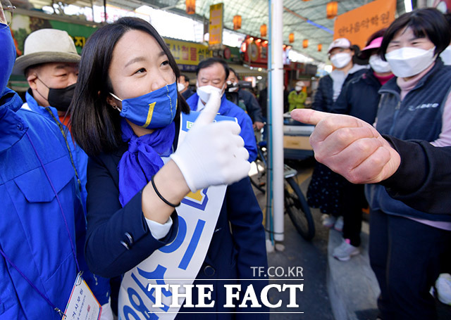 [더팩트ㅣ의왕=이덕인 기자] 제 21대 국회의원 선거에서 경기 의왕·과천에 출마한 이소영 더불어민주당 후보가 8일 오후 경기 의왕시 부곡동 도깨비시장에서 유권자들에게 지지를 호소하고 있다.