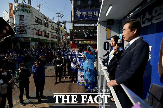 [더팩트ㅣ의왕=이덕인 기자] 이낙연 더불어민주당 상임선대위원장(오른쪽)이 8일 오후 경기 의왕시 부곡동 도깨비시장에서 이소영 경기 의왕·과천 후보(오른쪽 두번째) 지원 유세를 하고 있다.