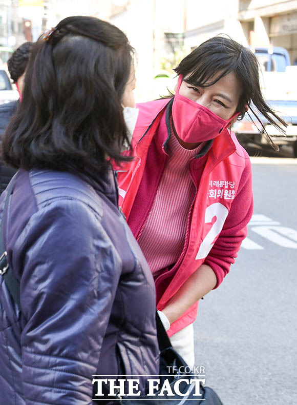 [더팩트ㅣ김세정 기자] 제21대 총선 서울 광진을에 출마한 오세훈 미래통합당 후보의 부인 송현옥 씨가 8일 오후 서울 광진구 성자초등학교 인근에서 주민들에게 인사하고 있다.sejungkim@tf.co.kr사진영상기획부 photo@tf.co.kr