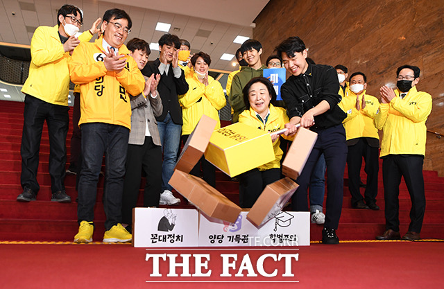 [더팩트ㅣ국회=배정한 기자] 심상정 정의당 대표(가운데)가 9일 오전 서울 여의도 국회 로텐더홀 앞 계단에서 열린 18세 투표 캠페인 '생애 첫 투표는 정의당에게' 행사에 참석해 청소년 당원들과 퍼포먼스를 펼치고 있다. hany@tf.co.kr 사진영상기획부 photo@tf.co.kr
