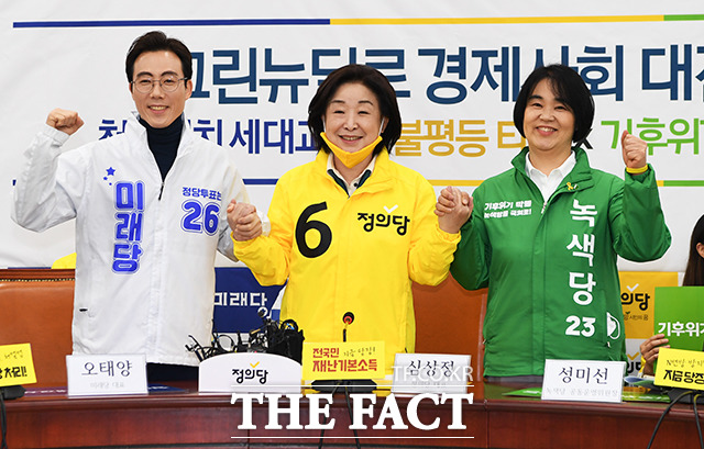 [더팩트ㅣ국회=배정한 기자] 오태양 미래당 대표와 심상정 정의당 대표, 성미선 녹색당 공동운영위원장(왼쪽부터)이 9일 오전 서울 여의도 국회에서 열린 정의당-녹색당-미래당 공동의제 공동캠페인 선언식에 참석해 구호를 외치고 있다. hany@tf.co.kr 사진영상기획부 photo@tf.co.kr