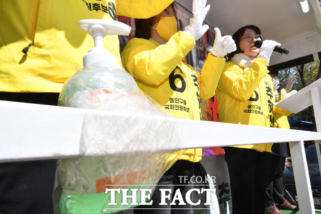 [더팩트 | 안양=남윤호 기자] 추혜선 정의당 안양동안을 후보가 9일 경기도 안양시 평안동 일대에서 유세차에 올라 유세를 펼치고 있다. 왼쪽에는 코로나19 확산 방지를 위해 유권자와 후보자가 사용하는 손소독제가 고정돼 있다.