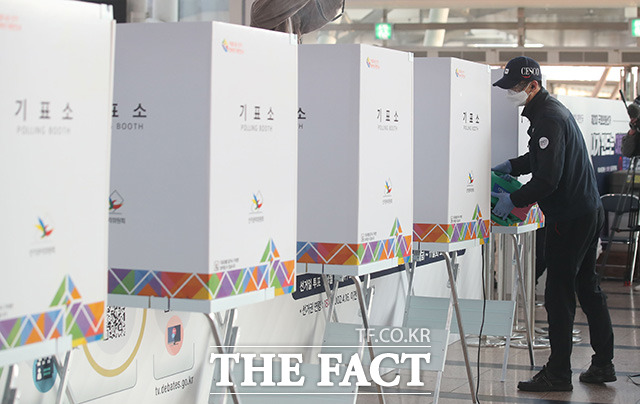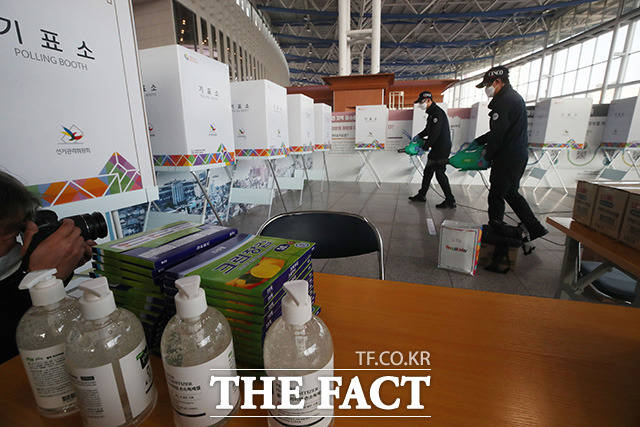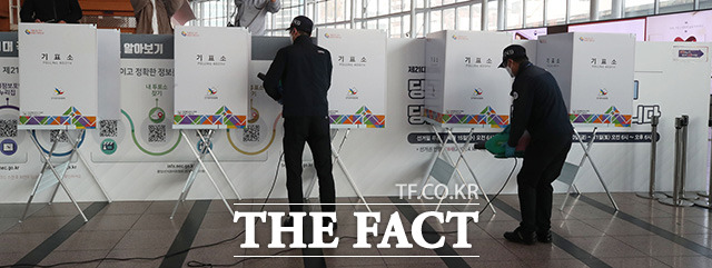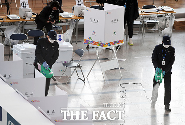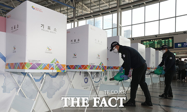 [더팩트ㅣ이동률 기자] 제21대 국회의원선거 사전투표를 하루 앞둔 9일 오후 서울 용산구 서울역 대합실에 설치된 남영동 사전투표소에서 방역 관계자들이 기표소를 방역 소독 작업하고 있다.