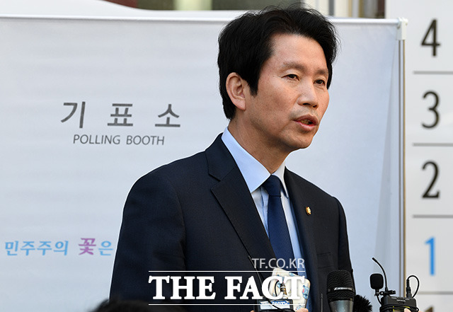 [더팩트ㅣ남용희 기자] 이인영 더불어민주당 원내대표가 10일 오전 서울 구로구 오류제1동 주민센터 사전투표소에서 투표를 마친 뒤 투표를 독려하는 인터뷰를 하고 있다.