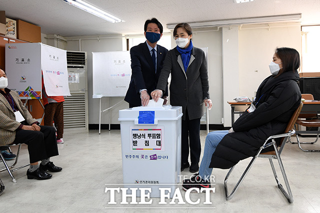 [더팩트ㅣ남용희 기자] 이인영 더불어민주당 원내대표(왼쪽)와 부인 이보은 씨가 10일 오전 서울 구로구 오류 제1동 주민센터 사전투표소에서 투표를 하고 있다.