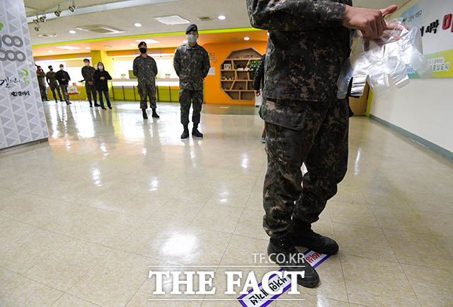 [더팩트ㅣ고양=김세정 기자] 제21대 총선 사전투표일인 10일 오전 경기도 고양시 덕양구청에 마련된 사전투표소에서 군 장병들이 코로나19 예방을 위해 대기선에서 일정한 간격을 지킨 채 서 있다.sejungkim@tf.co.kr사진영상기획부 photo@tf.co.kr