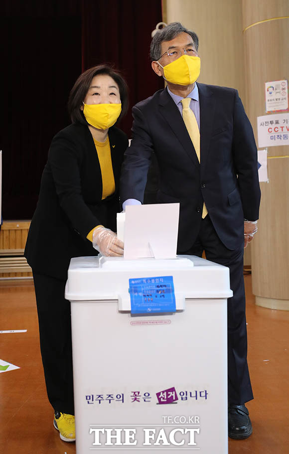 [더팩트ㅣ고양=김세정 기자] 제21대 총선에서 경기 고양갑에 출마한 정의당 심상정 후보(왼쪽)가 10일 오전 경기도 고양시 덕양구청에 마련된 사전투표소에서 남편 이승배 씨와 함께 사전투표를 하고 있다.