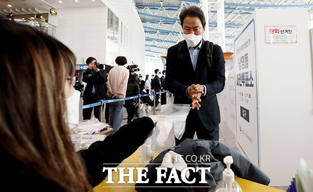 [더팩트ㅣ이덕인 기자] 제21대 국회의원선거 사전투표 첫날인 10일 오전 서울 용산구 서울역에 마련된 남영동 사전투표소에서 임종석 전 대통령 비서실장이 투표를 하고 있다.