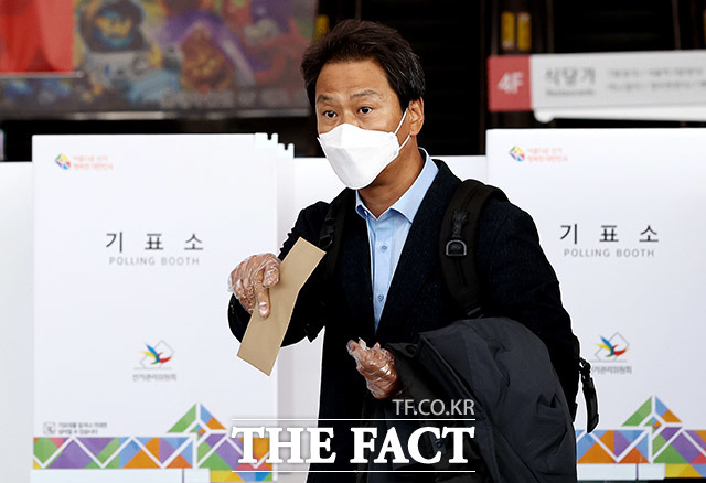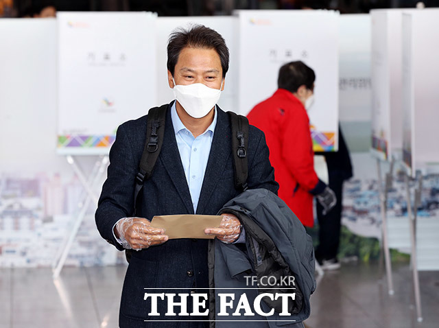 제21대 국회의원선거 사전투표 첫날인 10일 오전 서울 용산구 서울역에 마련된 남영동 사전투표소에서 임종석 전 대통령 비서실장이 투표를 하고 있다. /이덕인 기자
