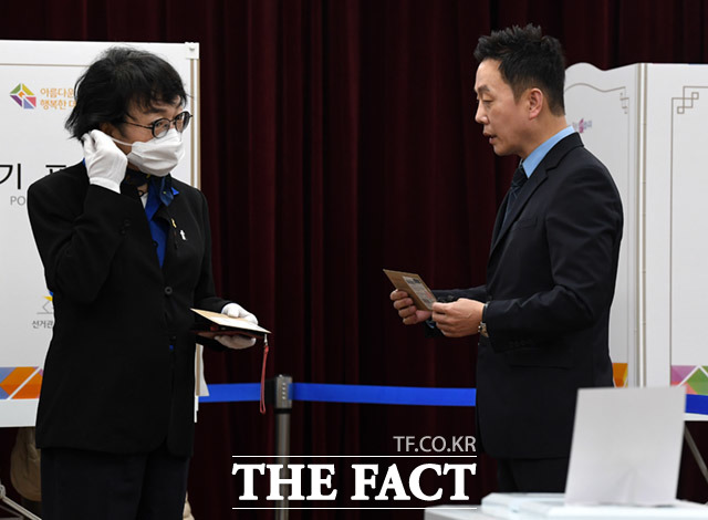 [더팩트ㅣ임세준 기자] 정봉주 열린민주당 최고위원(오른쪽)과 김진애 비례대표 후보가 10일 오전 서울 마포구 서강동 주민센터에서 4.15총선 사전투표를 하고 있다.
