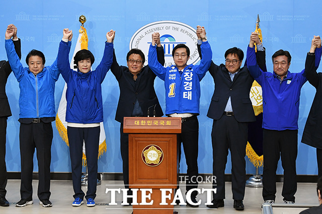 [더팩트ㅣ국회=배정한 기자] 더불어민주당 4·15 총선 공천에서 탈락해 무소속으로 출마한 서울 동대문을 민병두 후보(왼쪽 세번째)가 10일 서울 여의도 국회 소통관 기자회견장에서 불출마를 선언한 뒤 장경태 더불어민주당 후보(왼쪽 네번째)를 지지하겠다고 밝히고 있다.