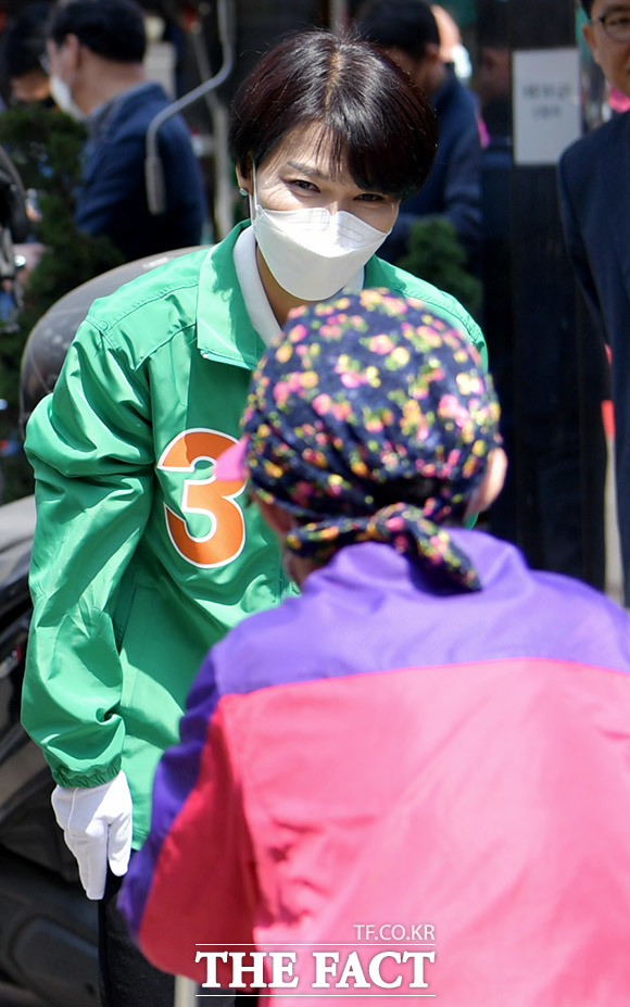 [더팩트ㅣ이덕인 기자] 김정화 민생당 공동대표가 10일 오후 서울 용산구 용문전통시장에서 권혁문 용산 국회의원 후보의 유세현장을 찾아 상인들과 인사하고 있다.