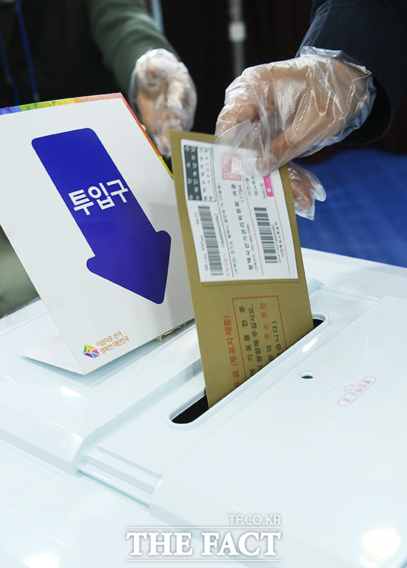 [더팩트ㅣ이동률 기자] 제21대 국회의원 선거사전투표 첫날인 10일 오후 서울 강남구 압구정동 사전투표소에서 유권자들이 비닐장갑을 착용한 채 투표하고 있다.