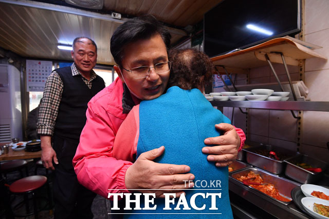 [더팩트 | 남윤호 기자] 황교안 미래통합당 종로 국회의원 후보가 10일 오전 서울 종로구 세운상가 인근 식당을 찾아 식당을 운영하는 어르신과 포옹을 나누고 있다.