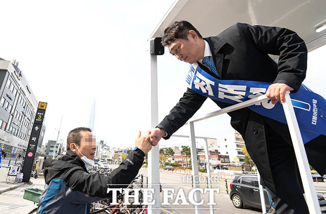 [더팩트ㅣ김세정 기자] 제21대 국회의원 선거에서 서울 송파을에 출마한 최재성 더불어민주당 후보가 10일 오후 서울 송파구 가락동 송파역 인근에서 유세를 하던 중 유권자와 주먹인사를 하고 있다.sejungkim@tf.co.kr사진영상기획부 photo@tf.co.kr