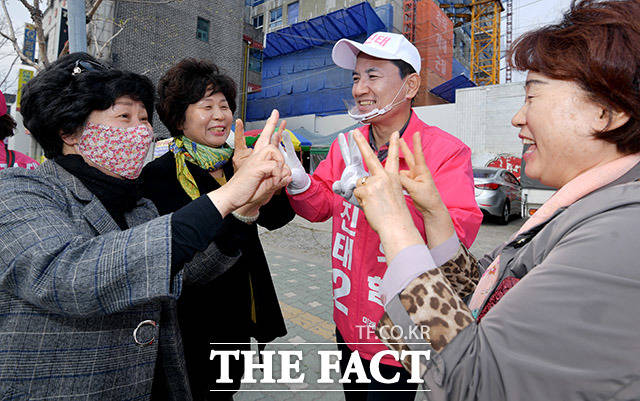 [더팩트ㅣ춘천=이덕인 기자] 김진태 미래통합당 춘천·철원·화천·양구갑 국회의원 후보(오른쪽)가 11일 오후 강원 춘천 국사봉길 일대에서 유권자들에게 지지를 호소하고 있다.