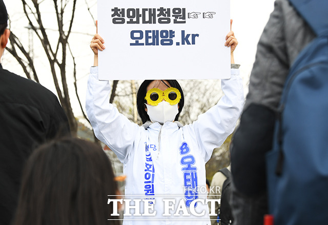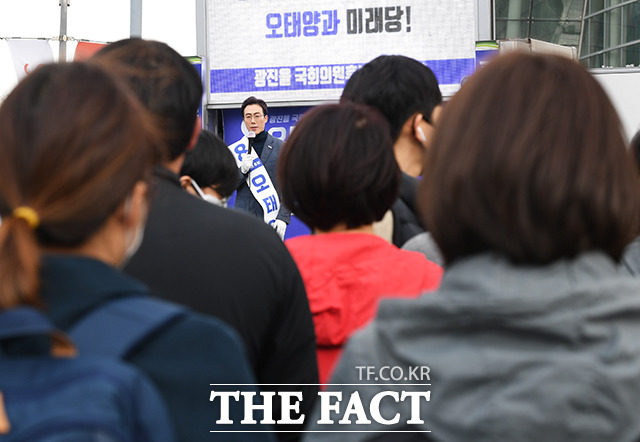 [더팩트ㅣ배정한 기자] 방송인 김제동(오른쪽)이 11일 오후 서울 광진구 롯데백화점 스타시티점 앞에서 열린 오태양 미래당 광진구을 국회의원 후보의 유세 현장을 찾아 유권자들에게 지지를 호소하고 있다.