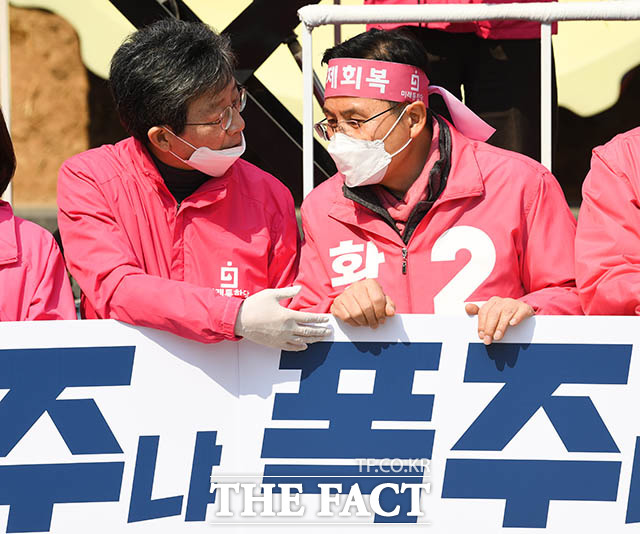 [더팩트ㅣ김세정 기자] 미래통합당 유승민 의원(왼쪽)과 4·15 총선에서 서울 종로에 출마한 황교안 후보가 12일 오전 서울 중구 청계광장에서 열린 미래통합당 4·15 총선 대국민 호소 유세에 참석해 이야기를 나누고 있다.