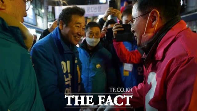 [더팩트ㅣ이효균 기자] 더불어민주당 이낙연 후보(왼쪽)와 미래통합당 황교안 후보가 12일 오후 서울 종로구 창신동 골목시장 상가방문 중 만나 인사를 나누고 있다.