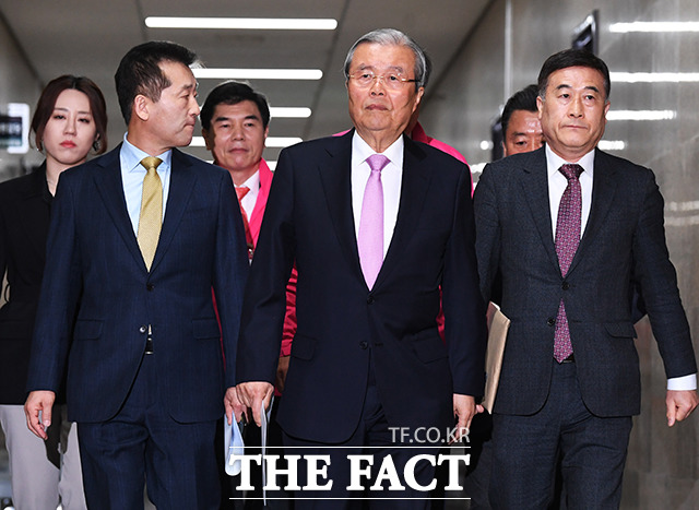 [더팩트ㅣ국회=배정한 기자] 김종인 미래통합당 총괄선거대책위원장(왼쪽 네번째)이 4·15 총선을 하루 앞둔 14일 오전 서울 여의도 국회에서 진행된 대국민 기자회견에 참석하고 있다.