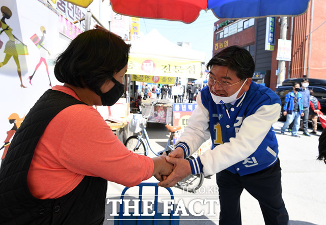 [더팩트ㅣ이천=임세준 기자] 4.15총선 이천시에 출마중인 더불어민주당 김용진 후보가 14일 오전 경기도 이천시 장호원재래시장에서 유세를 진행한 가운데 상인들을 만나 지지를 호소하고 있다.