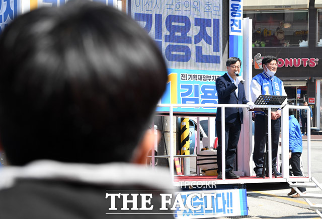 [더팩트ㅣ이천=임세준 기자] 4.15총선 이천시에 출마중인 더불어민주당 김용진 후보가 14일 오전 경기도 이천시 장호원재래시장에서 유세를 진행한 가운데 김동연 전 경제부총리 겸 기획재정부 장관이 참석해 김 후보 지지를 호소하고 있다.