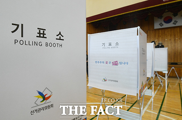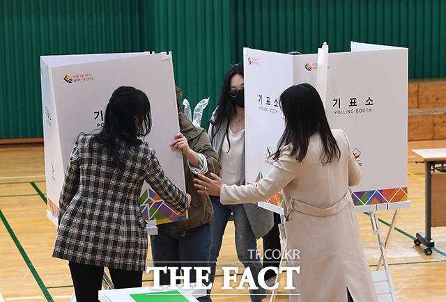 [더팩트ㅣ이동률 기자] 제21대 국회의원 선거를 하루 앞둔 14일 오후 서울 종로구 청운초등학교에 마련된 청운 효자동 투표소에서 선관위 관계자들이 투표 설비를 설치하고 있다.