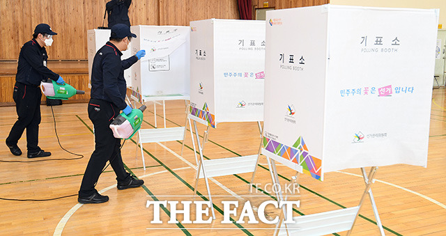 [더팩트ㅣ이동률 기자] 제21대 국회의원선거를 하루 앞둔 14일 오후 서울 종로구 청운효자동 제1투표소가 마련된 청운초등학교 체육관에서 방역업체 직원들이 투표소 방역작업을 실시하고 있다.