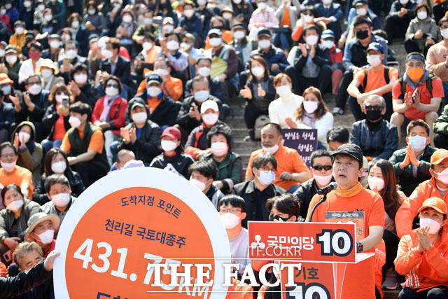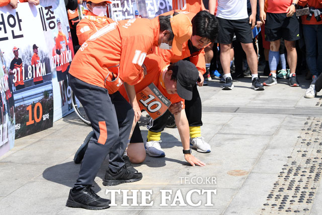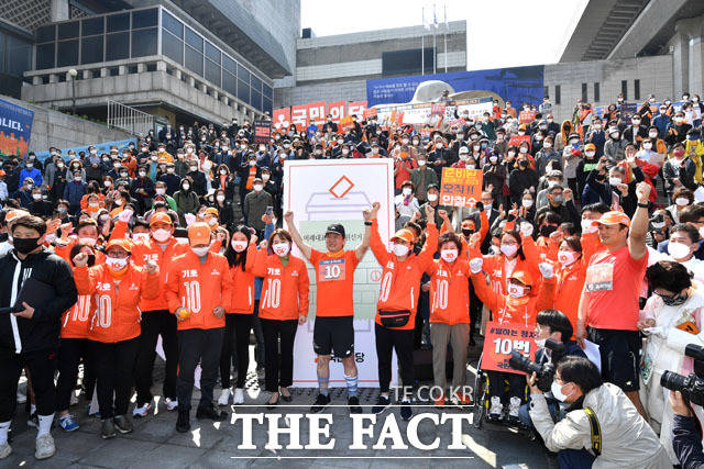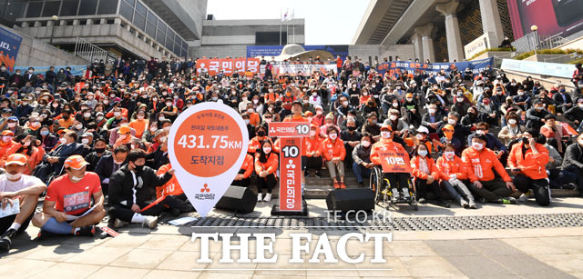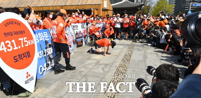 [더팩트 | 남윤호 기자] 431.75km 국토대종주를 마친 안철수 국민의당 대표가 14일 오후 서울 종로구 세종문화회관 계단에서 비례대표 후보들과 함께 기념촬영을 하고 있다.